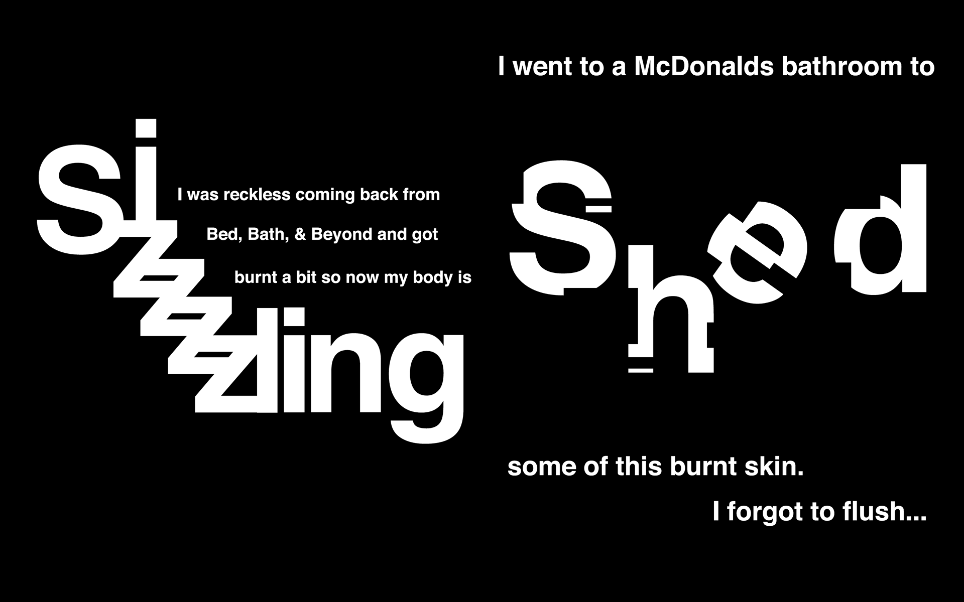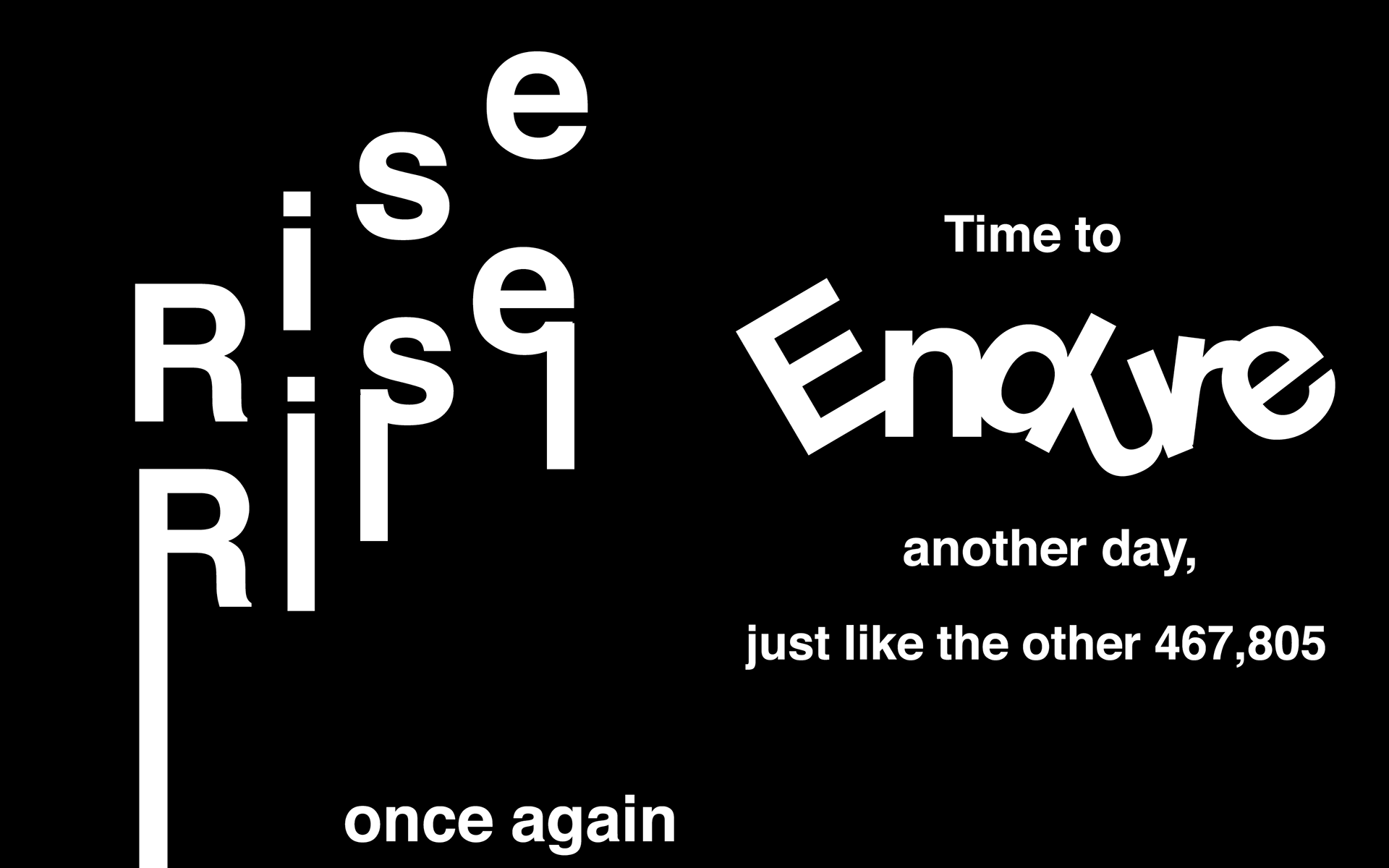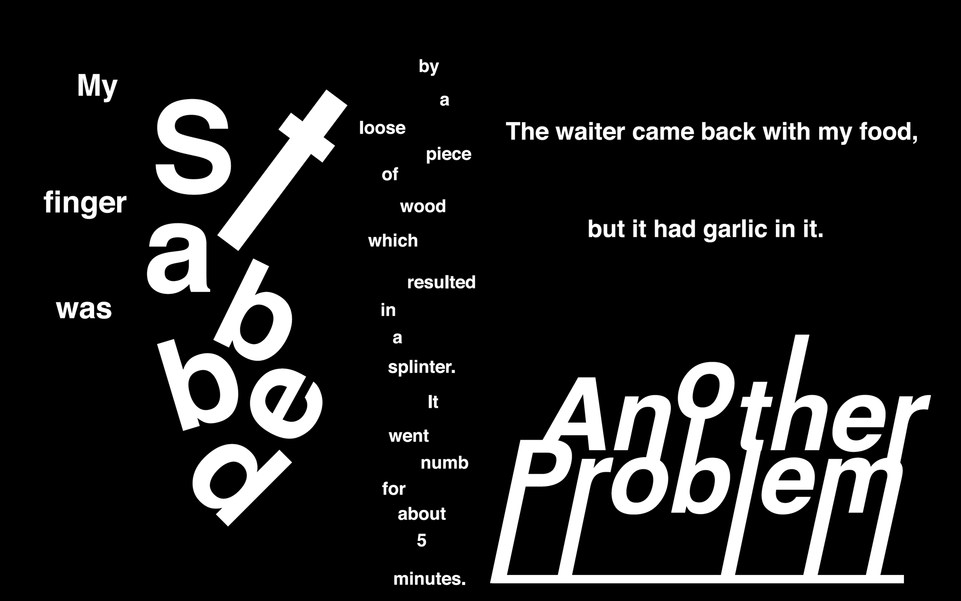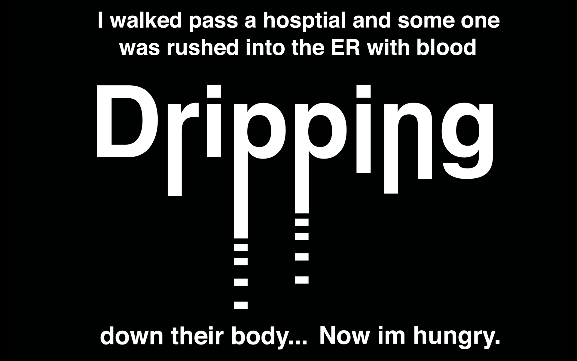 This book is about the day in the life of a depressed vampire. The book is made out of emphasized core words within the story that are manipulated in different ways. Vampires have it hard, so give them a break why don't ya.